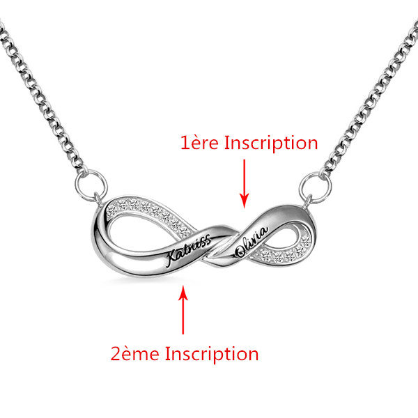 Symbole Infini signifie l'amour et l'amitié éternels. Matière première de ce collier est en argent et, il y a trois choix pour la couleur: platine, or et or rose. Pour la gravure, vous pouvez choisir maximum 2 prénoms pour adapter aux situations différentes. Nous pouvons également graver des mots ou des symbole comme coeur ou étoile. Mais veuillez noter que la gravure ne sera pas grande, car le pendentif est mignon. En tous cas, ce bijou sera un cadeeau idéal pour femmes. Créons-nous le bijoux unique et spécial.