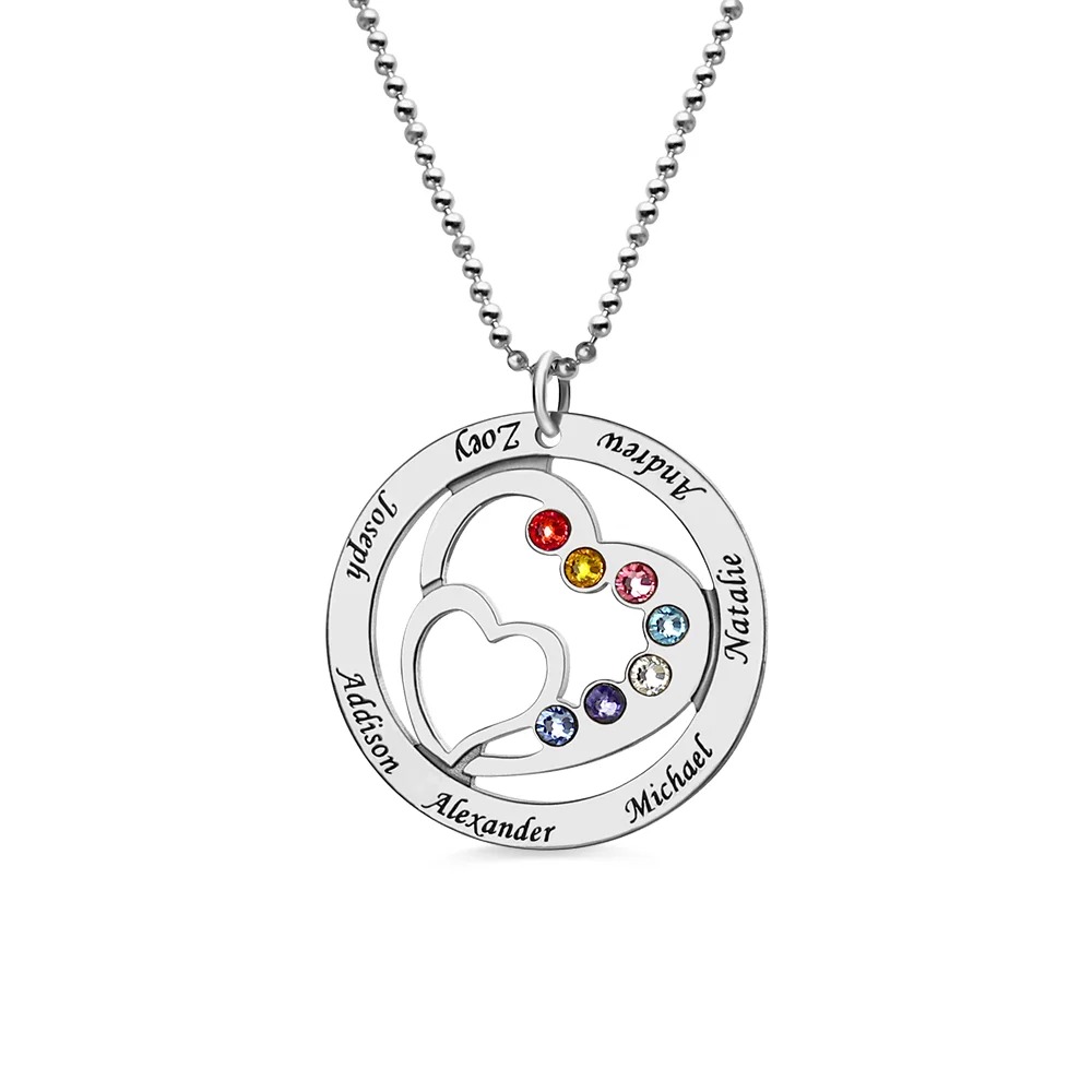 Ce beau collier avec Cœur et pierre de naissance peut être gravé au maximum sept prénoms et incrusté au plus sept pierres porte-bonneur.  Portant ce collier de maman magnifique, quand ses enfants lui manquent.